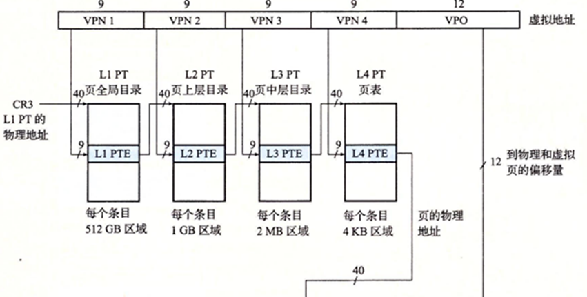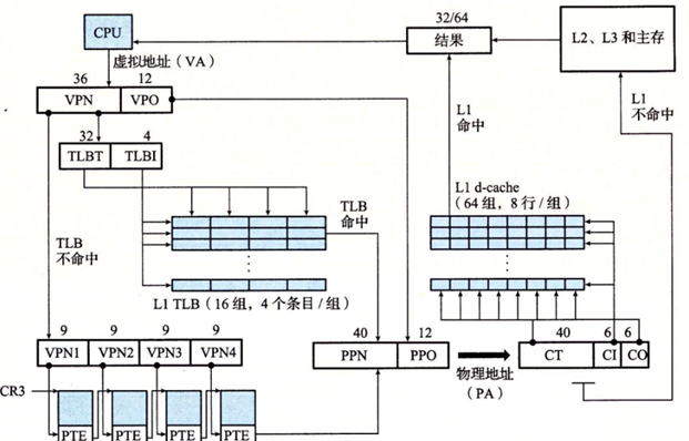 Core i7采用四级页表的层次结构。CPU产生虚拟地址VA,虚拟地址VA传送给MU,MMU使用VPN高位作为TLBT和TLBI,向TLB中寻找匹配。如果命中,则得到物理地址PA。如果TLB中没有命中,MMU查询页表,CR3确定第一级页表的起始地址,VPN1确定在第一级页表中的偏移量,查询出PTE,以此类推,最终在第四级页表中找到PPN,与VPO组合成物理地址PA,添加到PLT。工作原理如下: