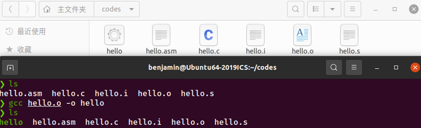 汇编阶段:将汇编代码转换为机器码,生成可重定位目标文件(hello.o)。