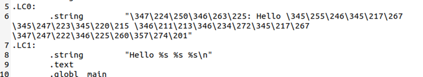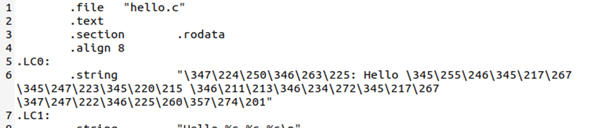 编译阶段:将预处理后的C代码转换为汇编代码(hello.s)。