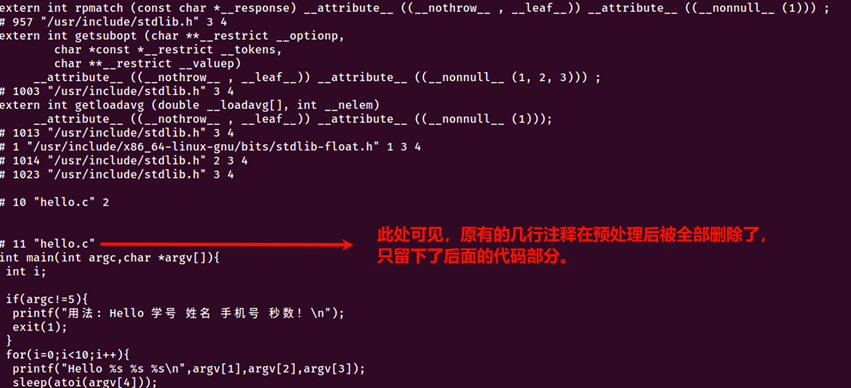 可以看到,预处理文件在头文件展开代码结束后紧跟着hello.c中的代码部分,原有的一些注释被全部删除了,这符合我们对预处理过程的认知。