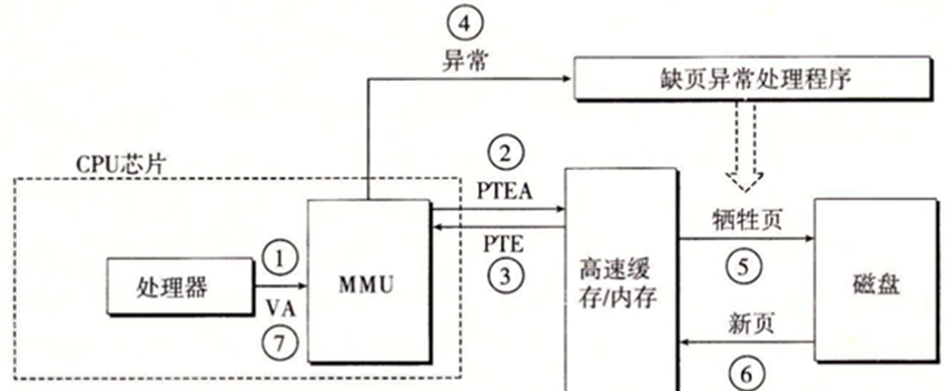 虚拟内存被组织为一个由存放在磁盘上的N个连续的字节大小的单元组成的数组。VM系统将虚拟内存分割,称为虚拟页,类似地,物理内存也被分割成物理页。利用页表来管理虚拟页,页表就是一个页表条目(PTE)的数组,每个PTE由一个有效位和一个位地址字段组成,有效位表明了该虚拟页当前是否被缓存在DRAM中,如果设置了有效位,那么地址字段就表示DRAM中相应的物理页的起始位置,如果发生缺页,则从磁盘读取。