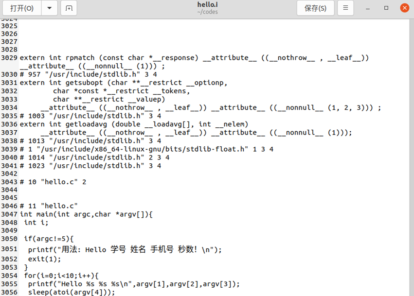 打开生成的hello.i文件,可见原本的c程序被预处理成为了3060行代码: