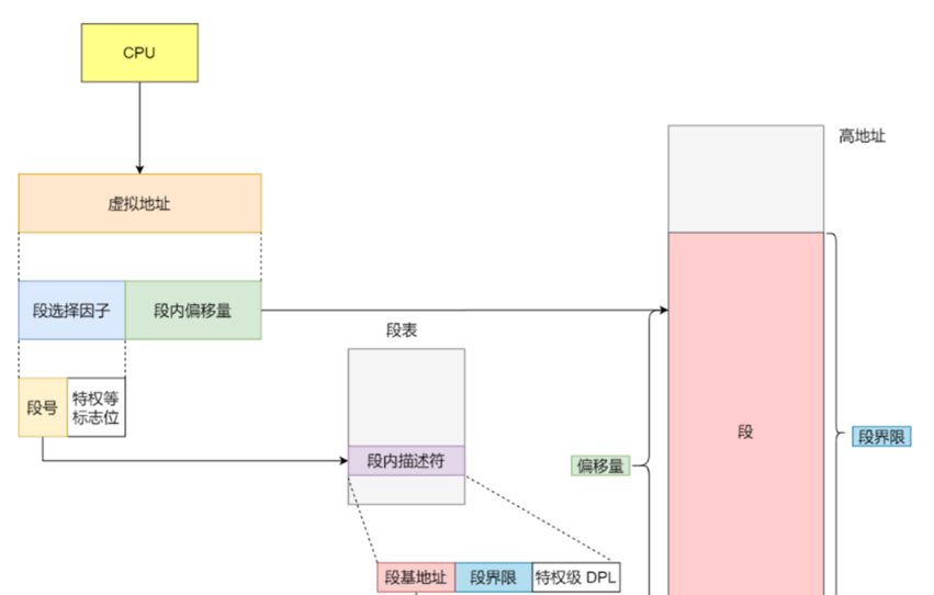 一个逻辑地址是两部分组成的,包括段标识符和段内偏移量。段标识符是由一个16位长的字段组成的,称为段选择符。其中前13位是一个索引号,后3位为一些硬件细节。索引号即是“段描述符”的索引,段描述符具体地址描述了一个段,很多个段描述符就组成了段描述符表。通过段标识符的前13位直接在段描述符表中找到一个具体的段描述符。