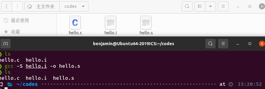 可以看到,在没有执行命令行时,该目录下只有hello.c一个文件;执行过预处理命令后,便多了生成的预处理文件:hello.i。同时也可以看到在当前目录的文件夹里出现了所预期的hello.i文件。