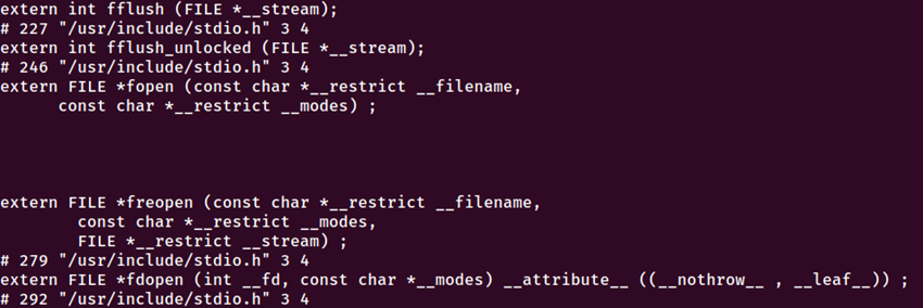 可以看到,一些库函数里的功能函数,比如fflush和相关的FILE操作函数,都被展开成了如上图所示的以extern为开头的声明格式。