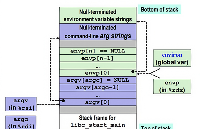 设置程序计数器。execve做的最后一件事情就是设置当前进程上下文的程序计数器,使之指向代码区域的入口点。如图所示:
