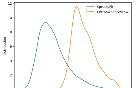 # 绘制 "Spruce/Fir" 和 "Cottonwood/Willow" 的预测异常分数的核密度估计图