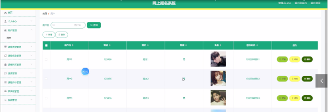 用户管理,在用户管理列表可以查看用户名、密码、姓名、性别、头像、联系电话