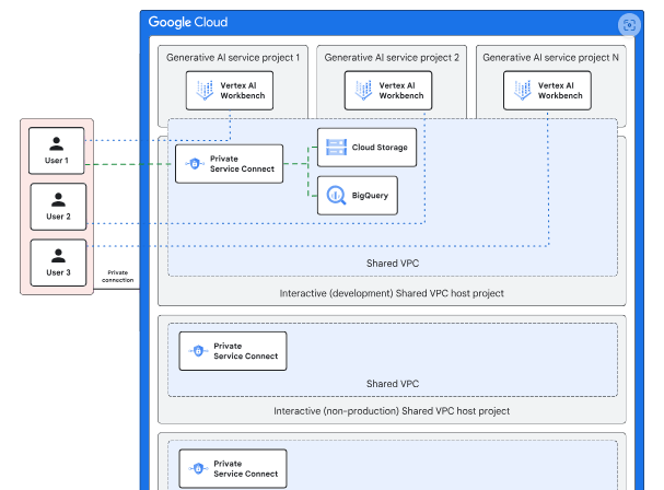 该蓝图利用企业基础蓝图中建立的共享 VPC 网络。在交互式(开发)环境中,Vertex AI Workbench 笔记本部署在服务项目内,允许本地用户通过共享 VPC 网络中的私有 IP 地址空间访问这些项目。