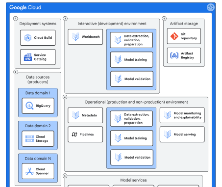 Service Catalog 和 Cloud Build 等服务有助于在交互式环境中部署 Google Cloud 资源。Cloud Build 还负责将这些资源和模型构建工作流部署到运营环境中。