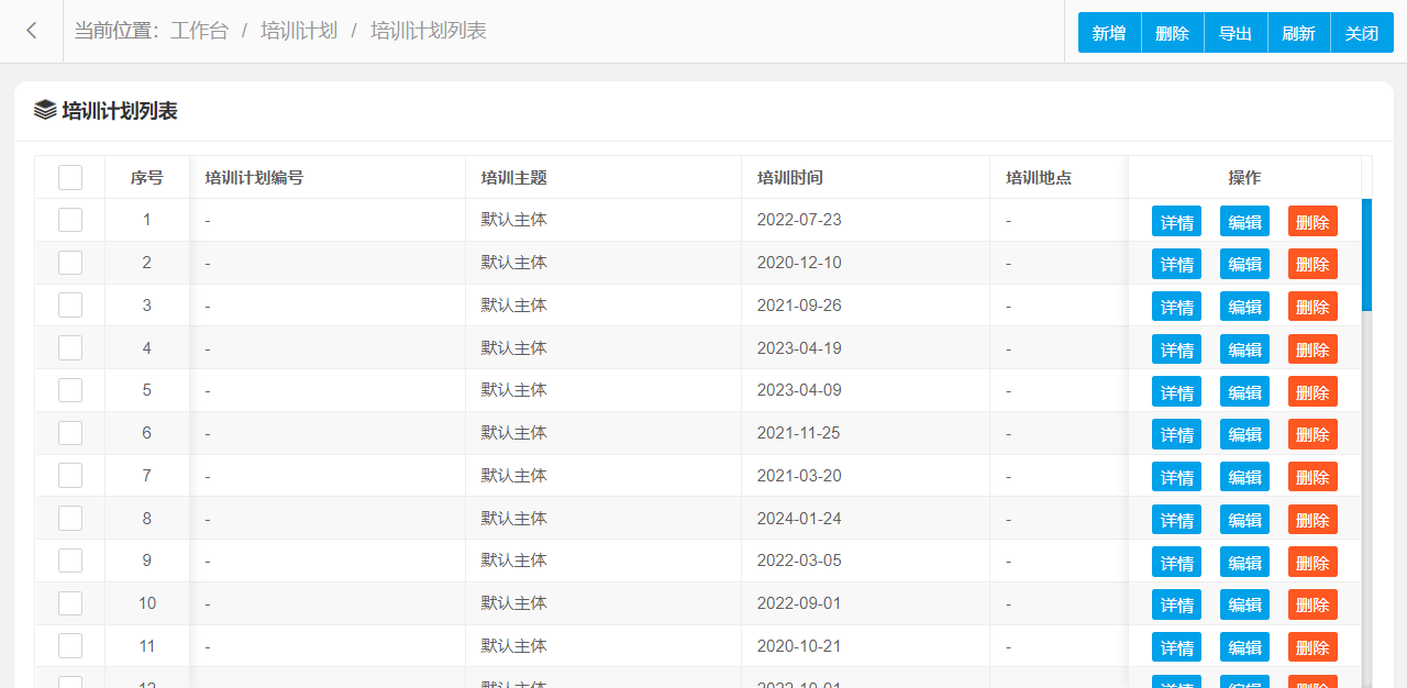 培训计划管理设置新增、编辑、删除、条件搜索、查看详情等操作,可按照页面提示进行操作执行,界面结构设计简单,操作流程简洁明了,可提升用户操作体验。