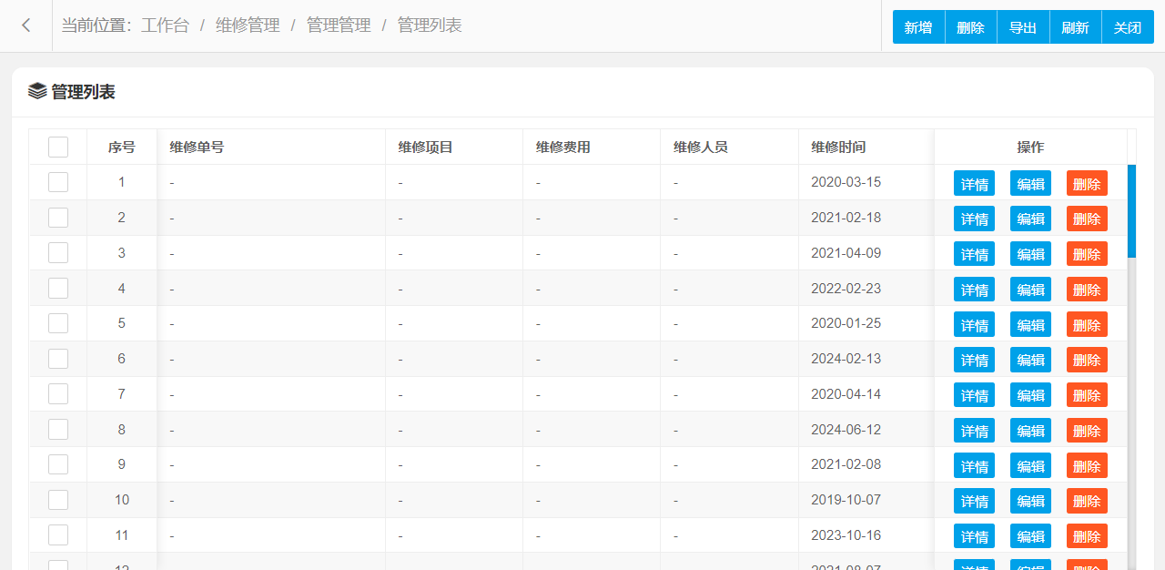 管理功能主要字段信息包含:管理编码、维修单号、维修项目、维修费用、维修人员、维修时间、维修结果等。使用表格形式展示数据信息,方便用户查看和编辑。