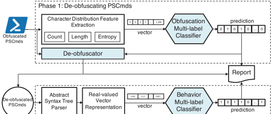 经过混淆的 PSCmd 非常复杂,为攻击者提供了隐藏恶意意图的灵活性,使其远离代码上下文。尽管许多作者已经对 PowerShell 的检测和反混淆进行了研究,但该问题仍未得到充分探索。本文介绍了多种混淆方法,并尝试使用深度学习和程序分析相结合的混合方法对 PSCmd 进行反混淆,然后使用多标签分类来分析其行为。利用程序分析中基于字符的原生特征以及抽象语法树 (AST) 抽象的集成实值向量表示,我们强调了自动反混淆和行为分析任务的改进机会,并弥合了恶意软件分析与机器学习之间的差距。然而,我们发现某些混淆并没有呈现出不同的文本表示和独特的字符分布。此外,将某些带有字符串操作的混淆方法准确恢复到其原始内容也十分困难。因此,我们将恢复问题转化为概念验证的语义相似性比较,这在某些情况下可能会带来风险。