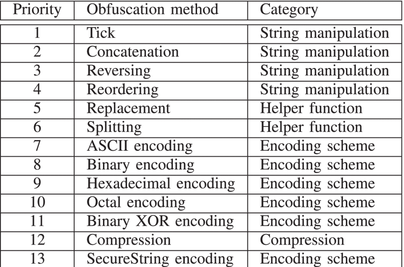 表 2列出了本文讨论的混淆方法的完整列表。公共 GitHub 存储库中给出了通过将上述 12 种混淆方法和 3 个辅助函数应用于清单 1中的 PSCmds 而得到的混淆 PSCmds 示例。5从示例中可以看出,PSCmds 的原始内容和意图被混淆所隐藏。此外,在不同的混淆中,PSCmds 的文本表示也发生了变化。因此,如果不进行去混淆,就很难理解 PSCmds 正在执行什么,从而影响取证分析和影响评估。但是,不同混淆策略的可能组合数量可能很大且很复杂。因此,我们需要一个程序或推荐的顺序来处理所有混淆方法的组合以进行恢复。