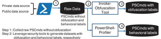 互联网上有许多公开的 PowerShell 语料库,例如 Microsoft PowerShell 库、GitHub 代码库和博客。然而,它们中的大多数都是非恶意的、未经过混淆且未标注的。为了评估我们的系统,我们需要一个标注数据集,该数据集能够提供 PSCmd 的混淆类型和恶意行为标签。因此,我们首先收集未经混淆的恶意软件衍生 PSCmd 作为主要数据集。然后,我们利用安全工具生成所需的带有混淆标签的混淆 PSCmd,并使用其行为标签对未混淆的 PSCmd 进行注释。图 3展示了我们数据集创建的流程图。我们将详细解释该过程。