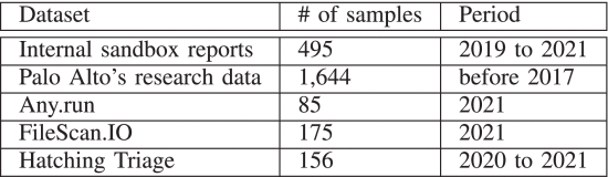 我们从内部沙盒分析报告中获取了恶意 PSCmd 作为初始数据集。为了进一步丰富数据集,我们还从开放数据集中收集了 PSCmd,包括 Palo Alto 的研究数据8和各种在线沙盒,例如 Any.run、9 FileScan.IO、10 Hatching Triage 11和 VirusShare (一个用于研究的恶意软件存储库)。除了 Palo Alto 的数据外,我们还使用关键字“PowerShell”并进行不区分大小写的搜索,从每个数据集中发现了所需的恶意 PSCmd。我们根据提交时间检查了 2019 年至 2021 年间检测到的所有脚本。表 6显示了我们从每个数据集中获得的恶意 PSCmd 的数量。所有接收到的脚本和命令均通过沙盒动态分析或至少三个防病毒程序的静态检测标识为恶意。在手动删除上一收集阶段重复和混淆的 PSCmd 后,我们最终得到了 3,057 个由恶意软件执行的未混淆的 PSCmd。