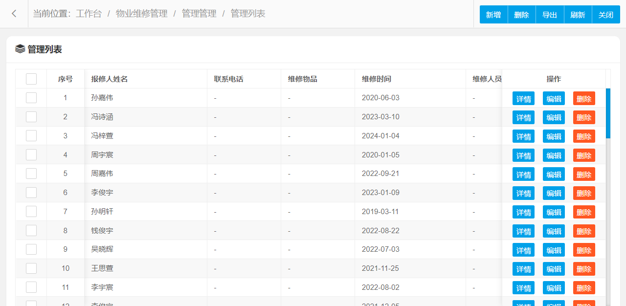 管理功能主要字段信息包含:管理编码、报修人姓名、联系电话、维修物品、维修时间、维修人员、维修费用、维修评价等。使用表格形式展示数据信息,方便用户查看和编辑。