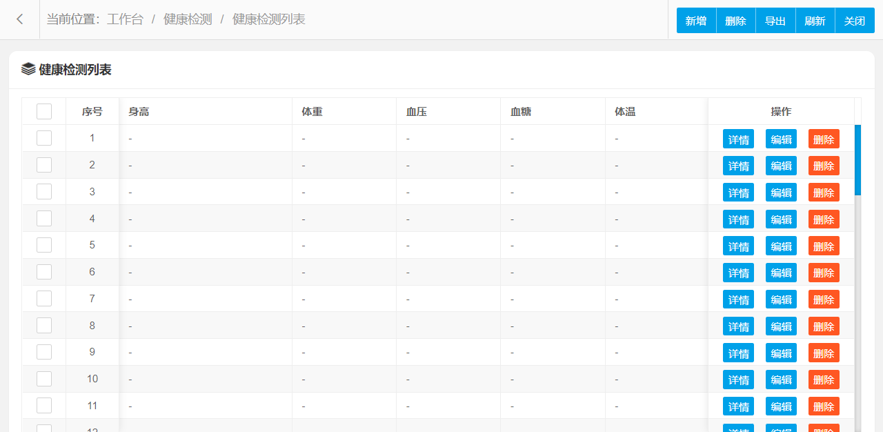 健康检测管理功能主要字段信息包含:编码、身高、体重、血压、血糖、体温、心率、备注等。使用表格形式展示数据信息,方便用户查看和编辑。