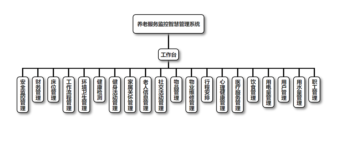 工作台包含:安全监控管理、财务管理、床位管理、工作流程管理、环境卫生管理、健康检测、健身活动管理、家属关怀管理、老人信息管理、社交活动管理、物品管理、物业维修管理、行程安排、心理健康管理、医疗服务管理、饮食管理、用电量管理、用户管理、用水量管理、职工管理,根据不同角色权限菜单展示会有所区别。