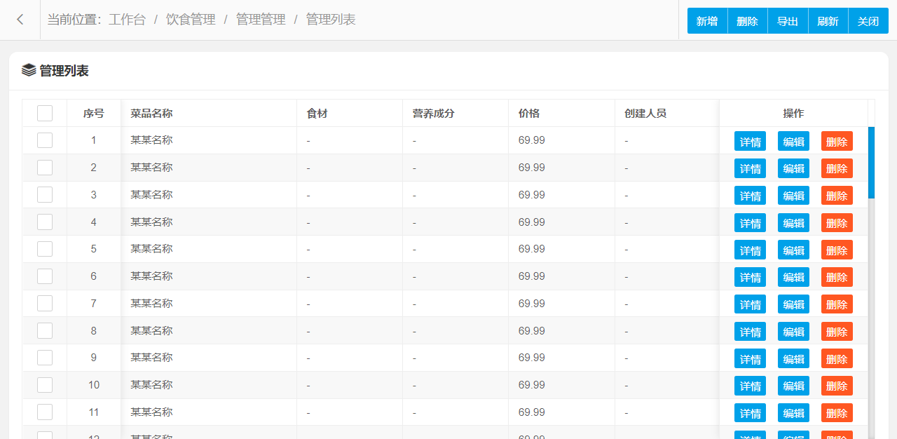 管理功能主要字段信息包含:管理编码、菜品名称、食材、营养成分、价格、备注等。使用表格形式展示数据信息,方便用户查看和编辑。