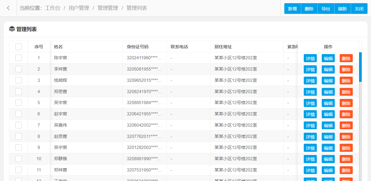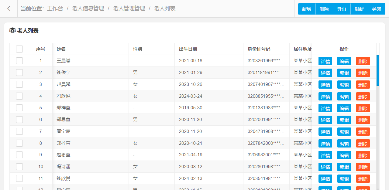 老人管理设置新增、编辑、删除、条件搜索、查看详情等操作,可按照页面提示进行操作执行,界面结构设计简单,操作流程简洁明了,可提升用户操作体验。