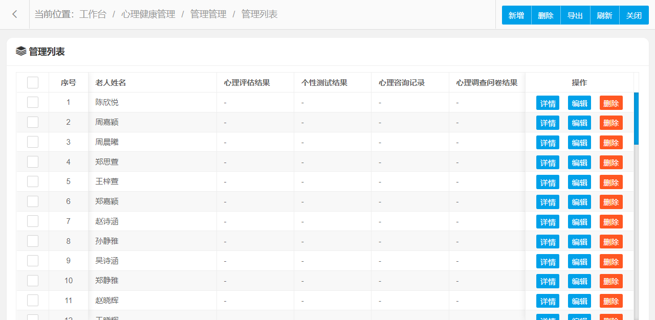 管理功能主要字段信息包含:管理编码、老人姓名、心理评估结果、个性测试结果、心理咨询记录、心理调查问卷结果等。使用表格形式展示数据信息,方便用户查看和编辑。