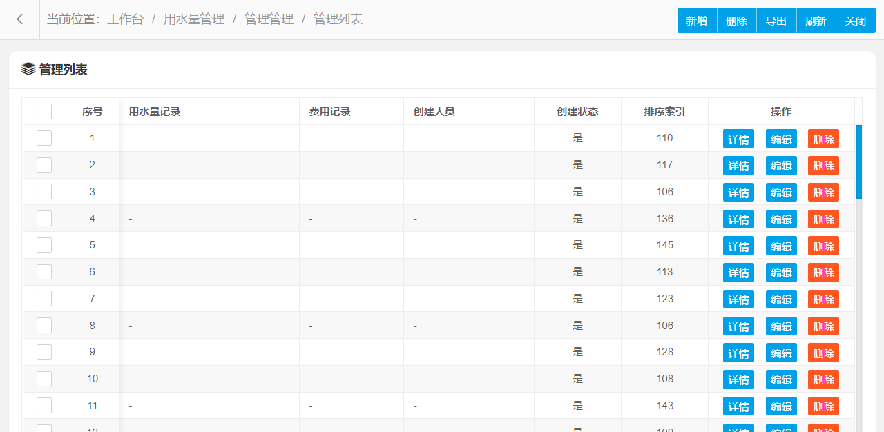 管理功能主要字段信息包含:管理编码、用水量记录、费用记录、备注等。使用表格形式展示数据信息,方便用户查看和编辑。