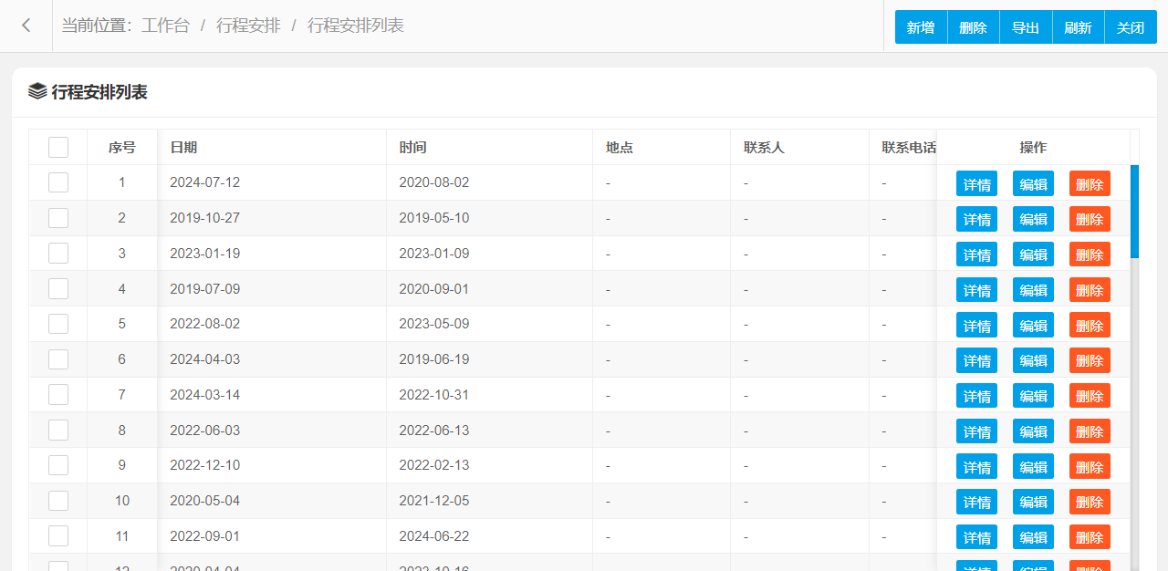 行程安排管理设置新增、编辑、删除、条件搜索、查看详情等操作,可按照页面提示进行操作执行,界面结构设计简单,操作流程简洁明了,可提升用户操作体验。