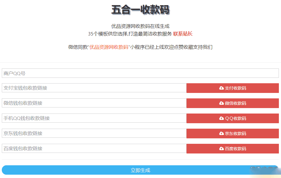源码说明:支持微信支付,支付宝支付,手机QQ支付,京东钱包,百度钱包,五合一收款,将其二维码合并为一个二维码,无需手续费,支持的qq头像,昵称判断,自带35套模板任您选择,打造最简洁的收款服务!