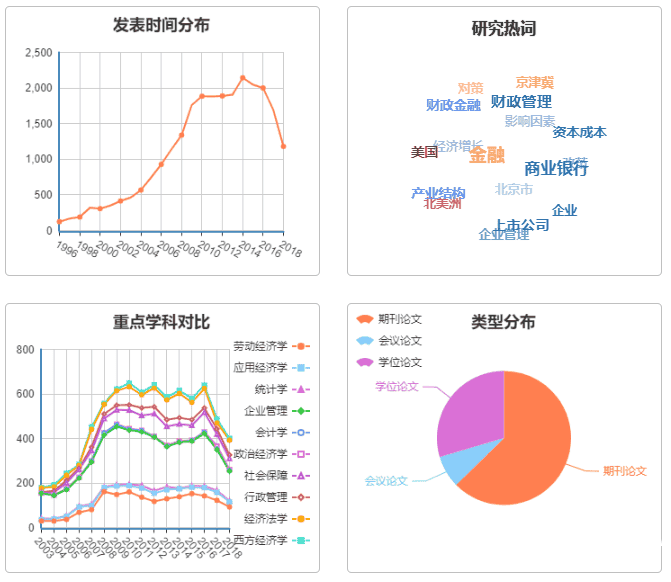 echarts统计图表插件制作折线图,饼状图,梯形图,经济学科数据图表实例。发布时间分布、研究热词、学科统计、重点学科对比、类型分布、访问趋势等6款数据统计图表代码。 © 版权声明文章版权归作者所有,未经允许请勿转载。如内容涉嫌侵权,请在本页底部进入<联系我们>进行举报投诉!THE END资源下载 如果内容对您有所帮助,就支持一下吧!点赞11 分享QQ空间微博QQ好友海报分享复制链接收藏