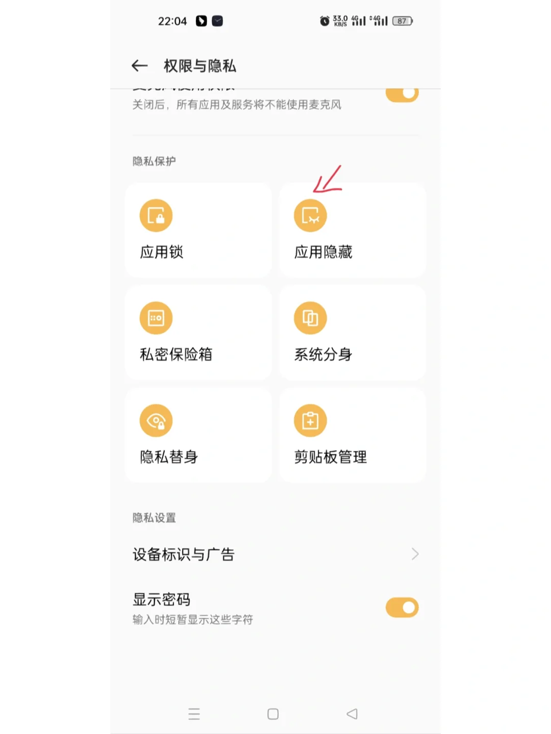 Oppo手机应该怎么隐藏软件菲姐的简书10个月前发布3218举报 1.打开设置 2.点击权限与隐私,输入你的锁屏密码 3.点击应用隐藏,点击你想要隐藏的软件,输入你想要的密码,就好啦 在拨号页面输入你定的密码,就会直接弹到一个窗口,里面就有你隐藏的软件 怎么回事啊