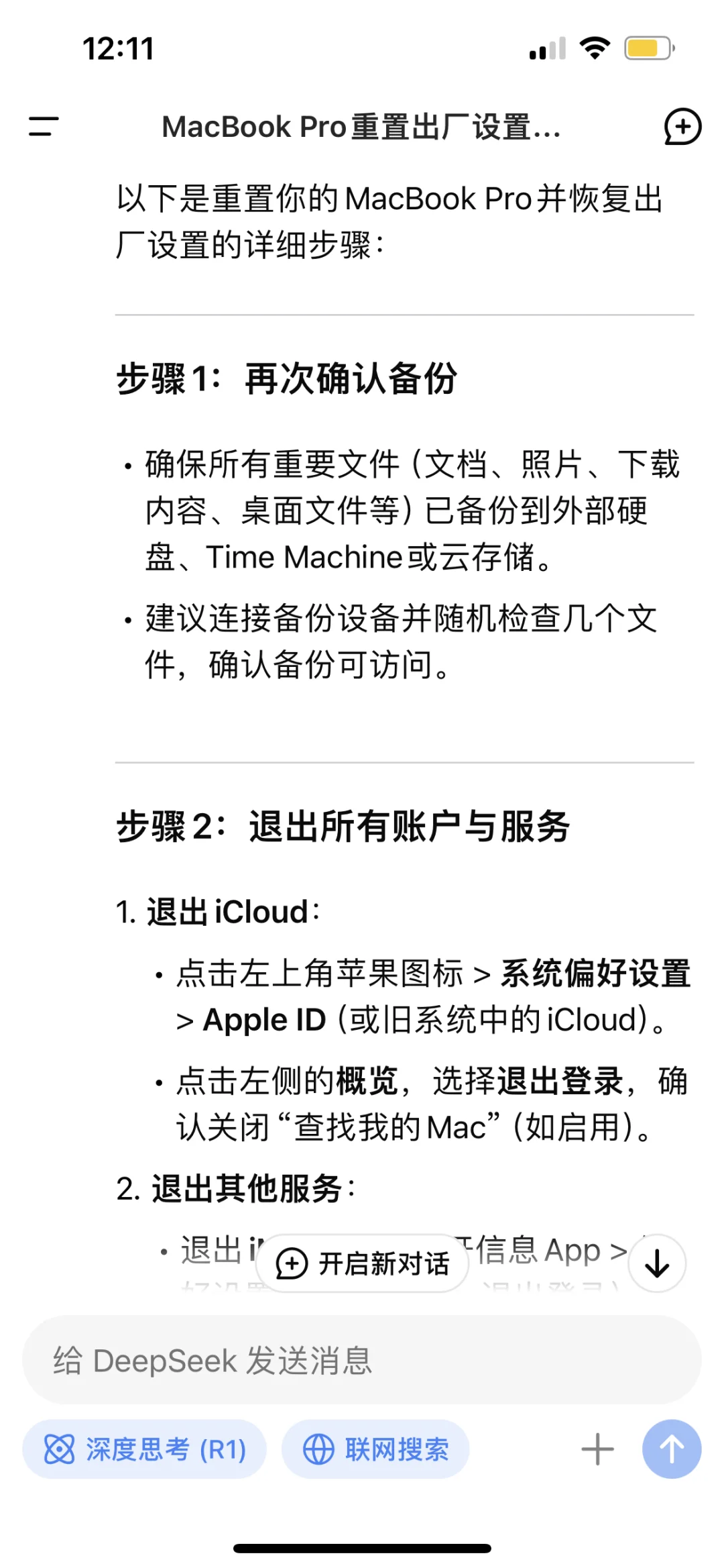 这两天终于想着要重置一下它,备份完文件之后本电脑白痴打算去店里让工作人员帮我重置,但后来突发奇想想着也许可以让DeepSeek给我提供操作思路。。。于是我按照DeepSeek给