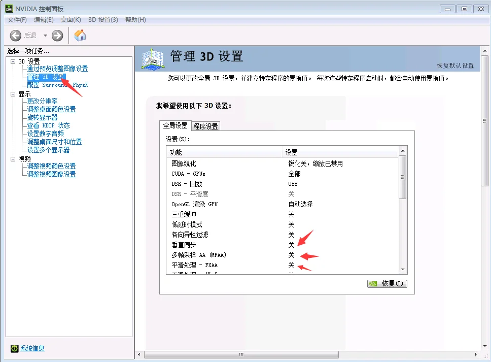 2.点击管理3D设置 关闭垂直同步 多帧采样 平滑处理