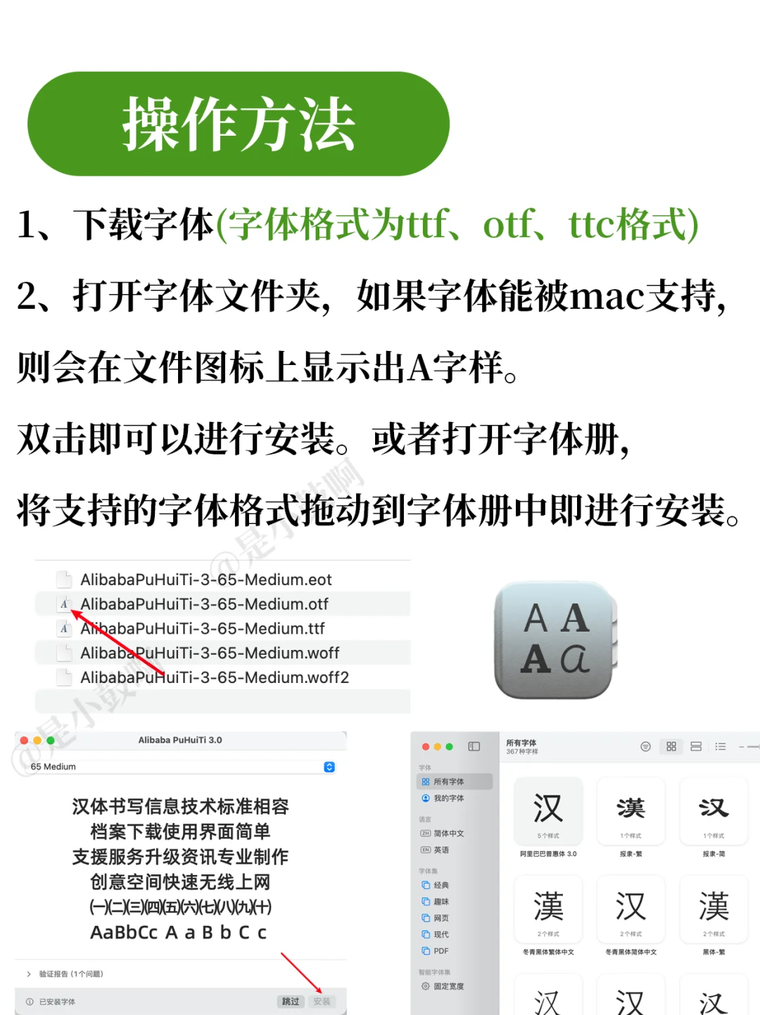 或者打开字体册,将支持的字体格式拖动到字体册中即进行安装。