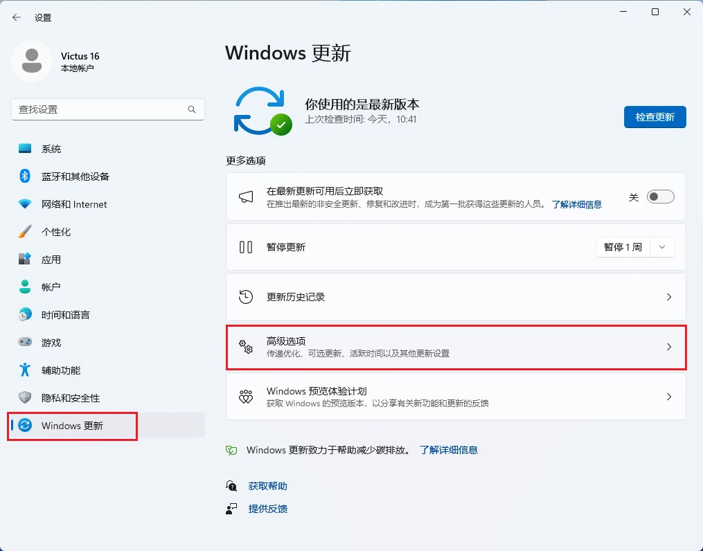 1. 打开系统设置,选择 Windows 更新,点击检查更新,将系统更新至最新。